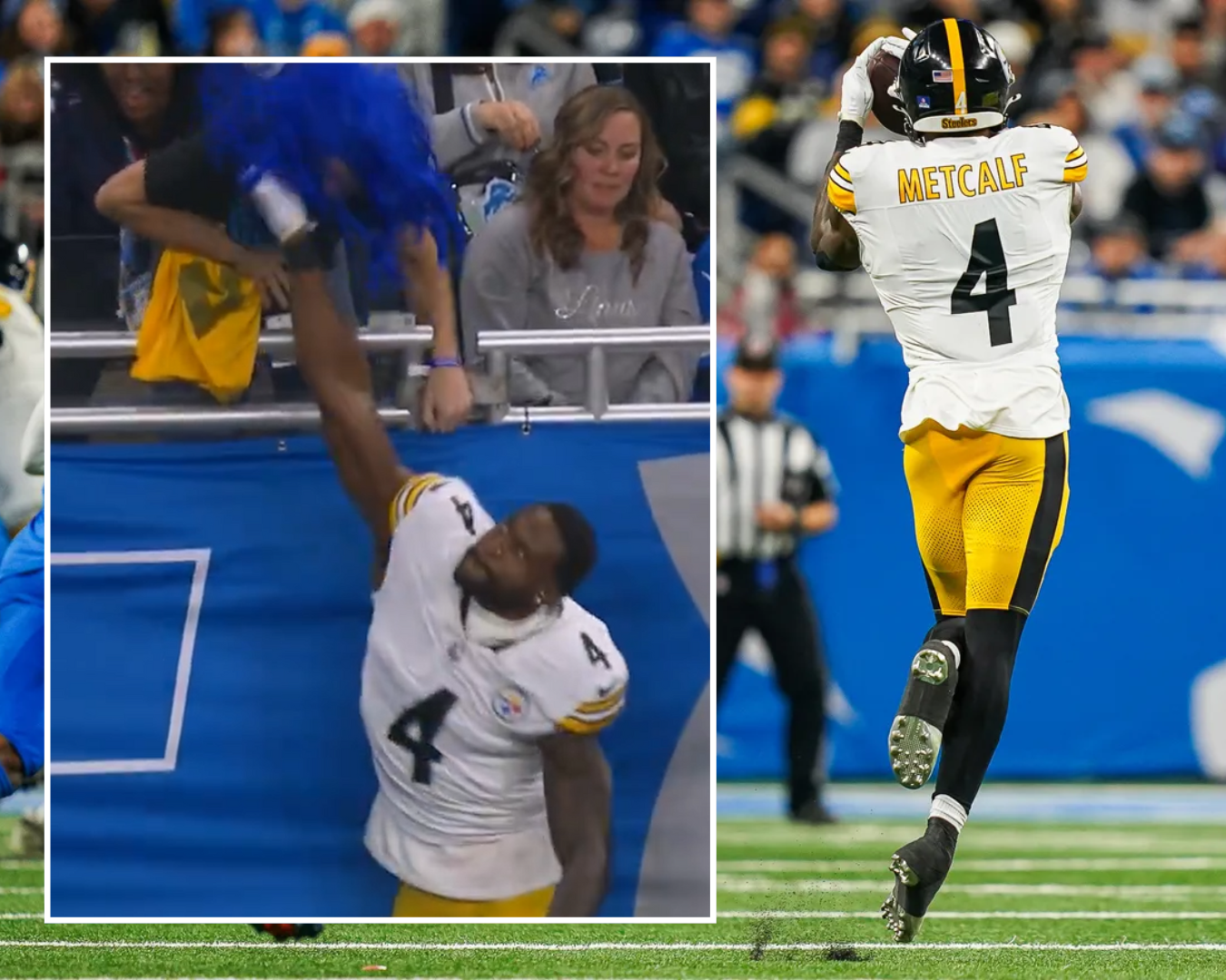 Pittsburgh Steelers wide receiver DK Metcalf swung at a Detroit Lions fan at Ford Field after the fan called him by his full name, DeKaylin Zecharius Metcalf, causing minor contact but no ejection. |